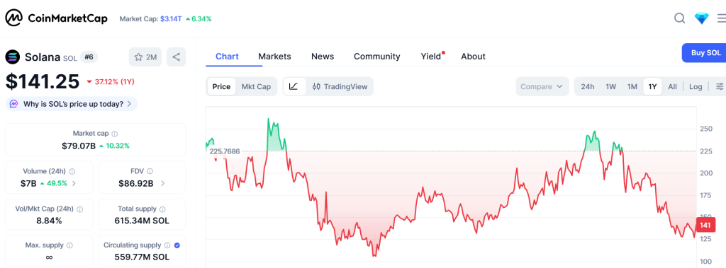 За последние 24 часа токен Solana вырос на 1%. В настоящее время он торгуется на уровне $141 после вчерашнего падения.