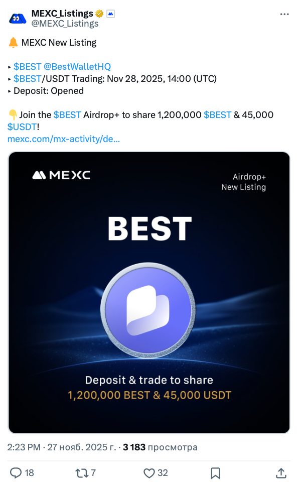Новость Токен $BEST от Best Wallet вышел на биржу MEXC: аирдроп на 1 200 000 BEST и 45 000 USDT была опубликована на Cryptonews На Русском.