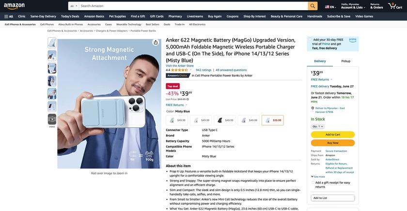 Речь идёт про модель Anker 622 Magnetic Battery в цвете Misty Blue за $39.99 $69.99, -43%. В наличии также есть другие цвета, но они стоят на $10 дороже.