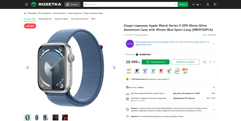 - Apple Watch Series 9 GPS, 45 мм — 20 999 грн