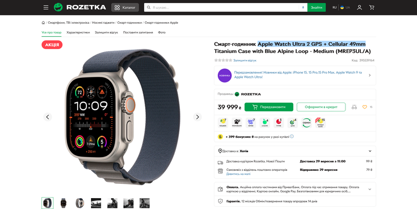 - Apple Watch Ultra 2 GPS + Cellular, 49 мм — 39 999 грн