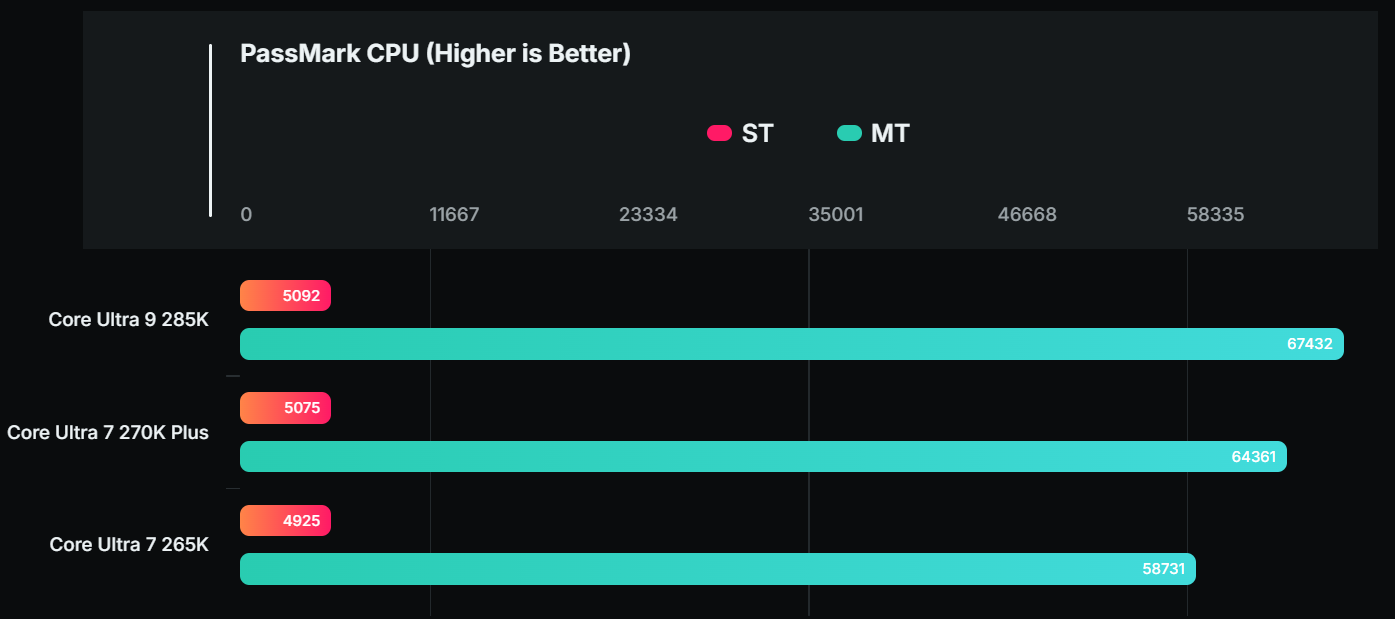 Intel Core Ultra 7 270K Plus майже наздогнав Core Ultra 9 285K за результатами тесту PassMark