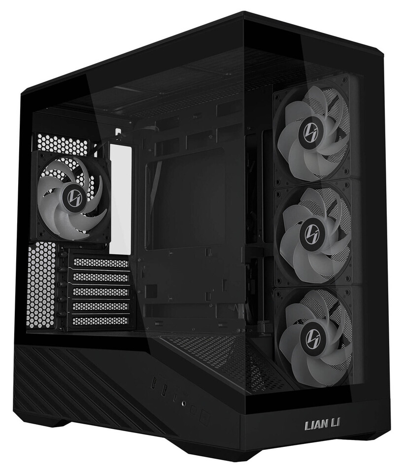Усередині Lian Li Vector V100 Mini знайдеться місце для п’яти карт розширення завдовжки до 415 мм, процесорного кулера заввишки до 163,5 мм, кількох 2,5‑дюймових накопичувачів і одного 3,5‑дюймового жорсткого диска. Підтримуються блоки живлення довжиною до 200 мм. Передбачено посадкові місця для дев’яти 120-мм вентиляторів і одного радіатора СРО типорозміру 240 або 360 мм. На панелі введення-виведення доступні два порти USB 3.2 Type‑A, один Type‑C і комбінований 3,5‑мм аудіороз’єм.