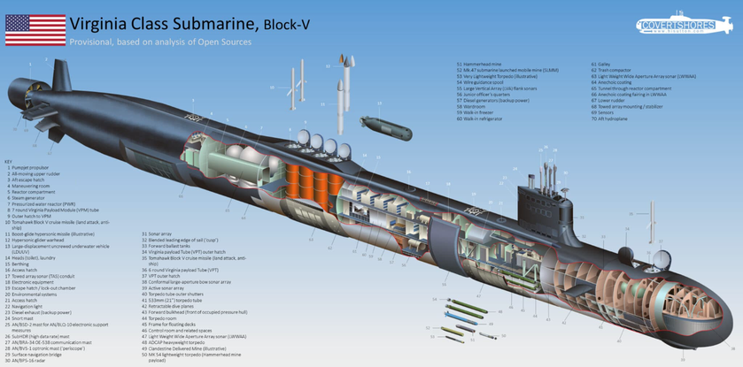 На данный момент Newport News Shipbuilding и GDEB имеют заказы на субмарины уровней Block IV и Block V. Модификация Block V отличается наличием модуля VPM (Virginia Payload Module). Он на 25 метров увеличивает длину подводной лодки и позволяет установить 40 вместо 12 крылатых ракет Tomahawk. В будущем субмарины класса Virginia получат гиперзвуковое оружие.