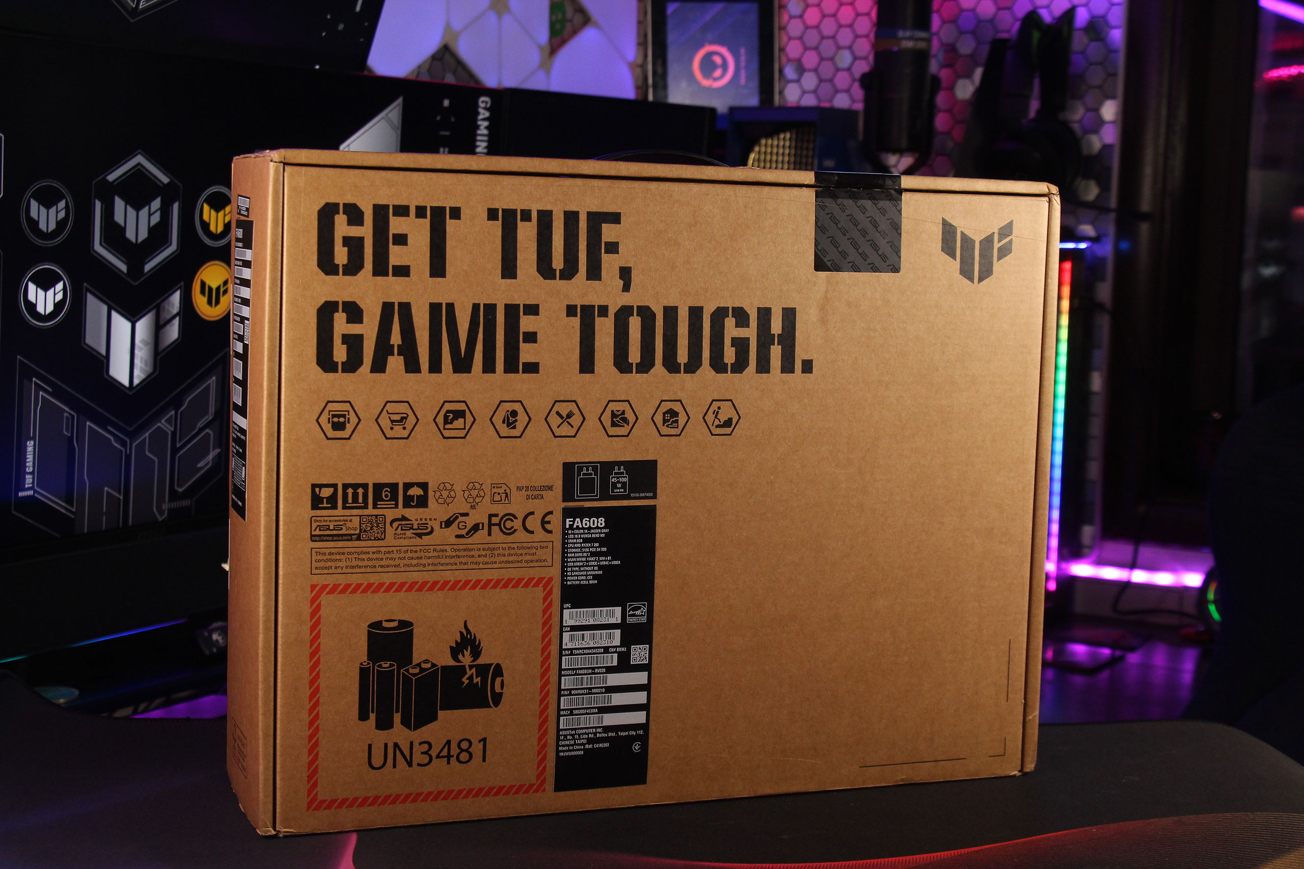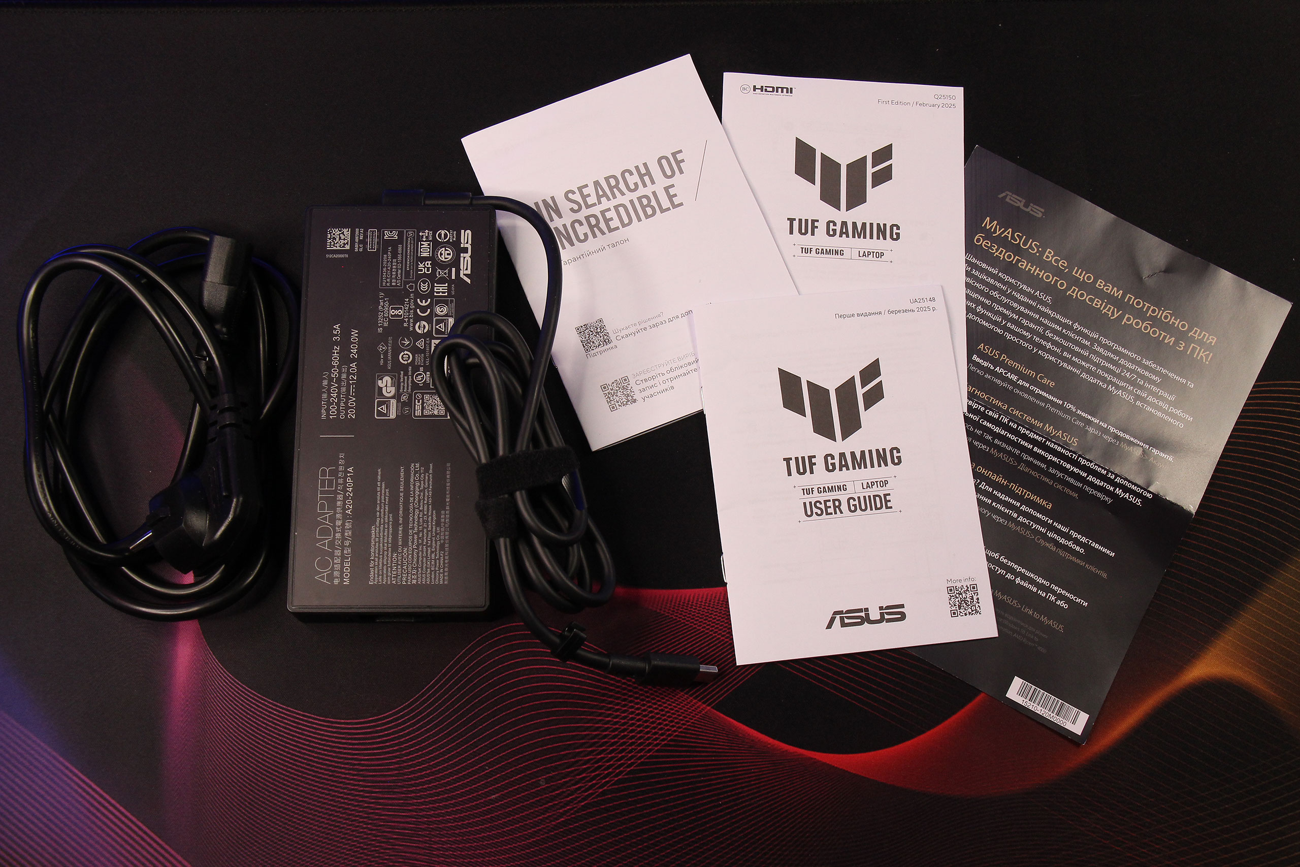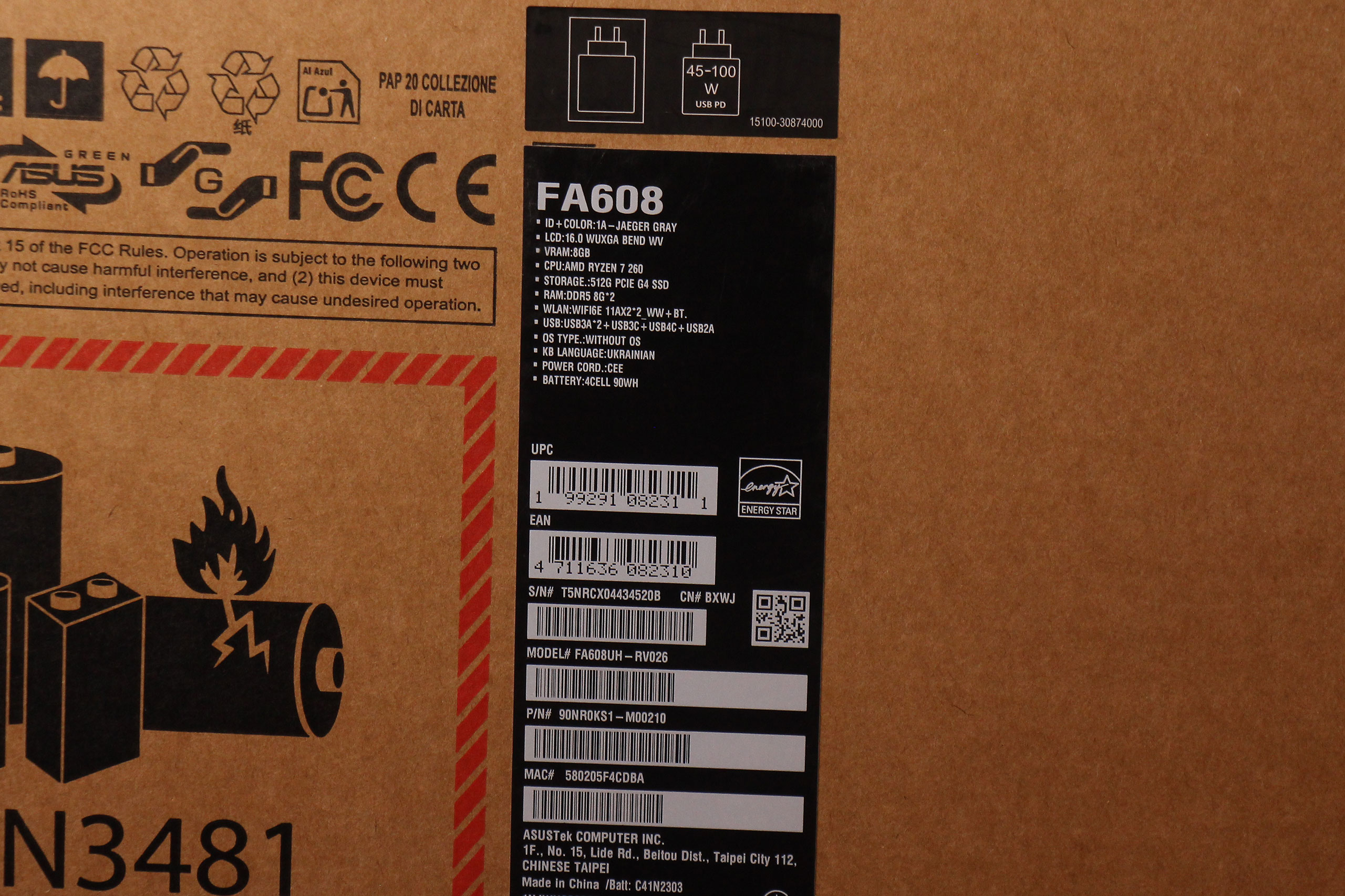 Ноутбук постачається у фірмовій коробці ASUS з характерним для серії TUF Gaming нехитрим оформленням.