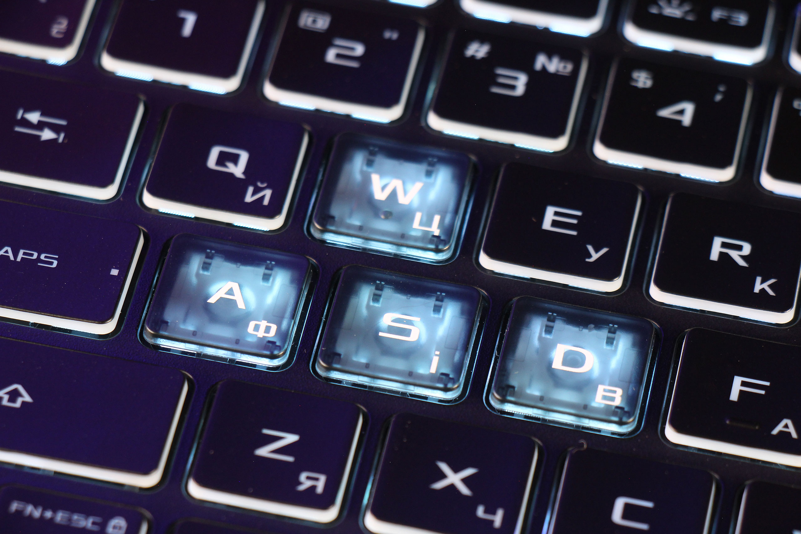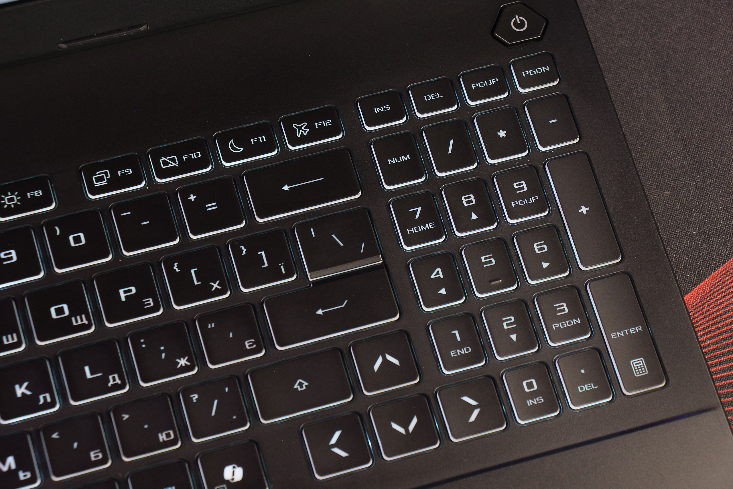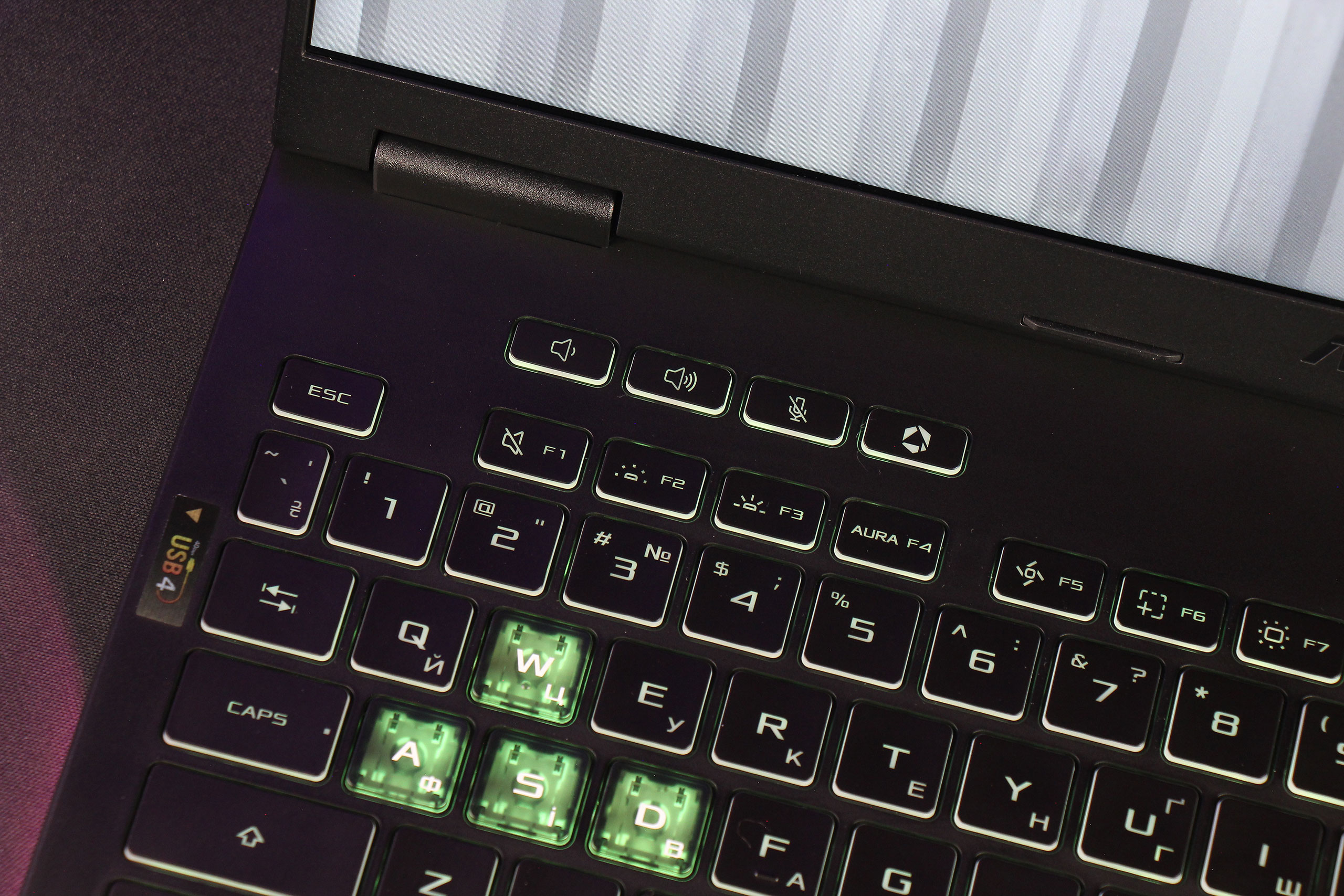 Клавіатура повнорозмірна з окремим цифровим блоком та щедрим, як для ноутбука, ходом клавіш в 1,7 мм. Ресурс клавіш складає понад 20 млн натискань. Підсвічування однозонне RGB з підтримкою AURA Sync. Присутня виділена клавіша Copilot.
