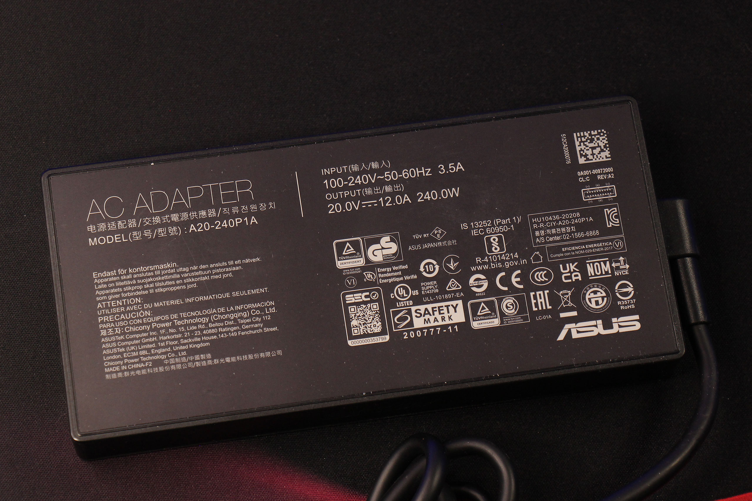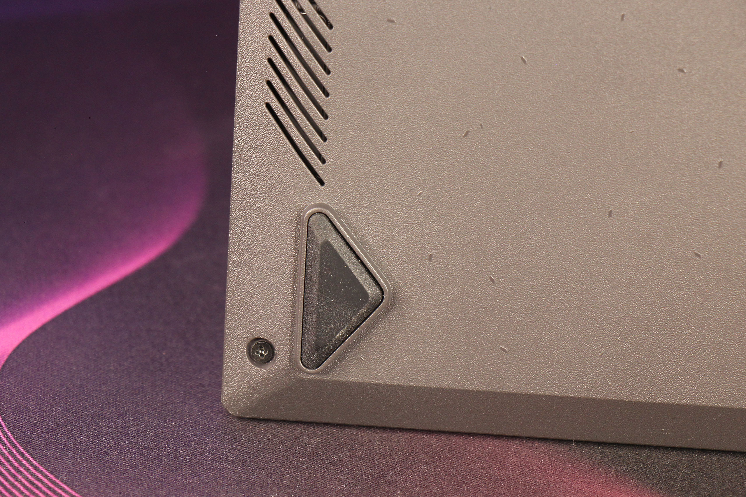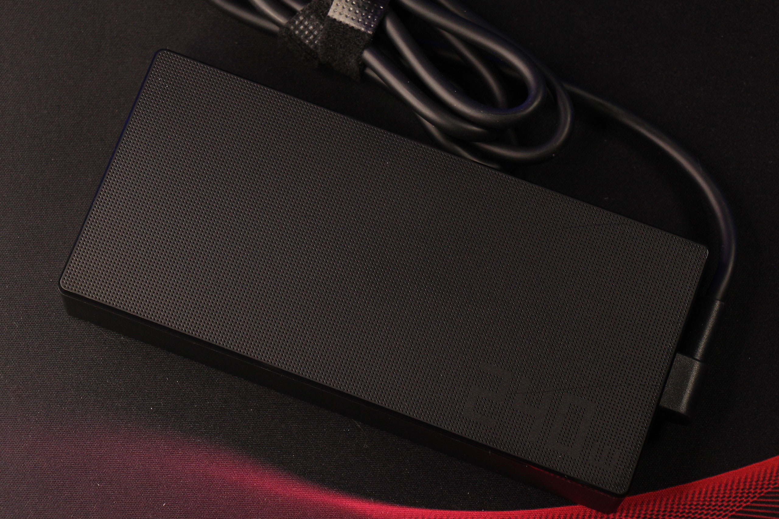 З лівого боку розміщено пропрієтарний роз’єм живлення для адаптера потужністю 240 Вт, порт RJ45 Gigabit Ethernet, відеовихід HDMI 2.1 FRL, порт USB4 Type‑C з пропускною здатністю 40 Гбіт/с та підтримкою DisplayPort, USB‑C 3.2 Gen 2 з виходом DisplayPort, Power Delivery та G‑Sync, а також USB 2.0 Type‑A та комбінований аудіороз’єм 3,5 мм. Порт USB4 помічений наліпкою, щоб не сплутати. Правий бік містить два порти USB‑A 3.2 Gen 2 і все.
