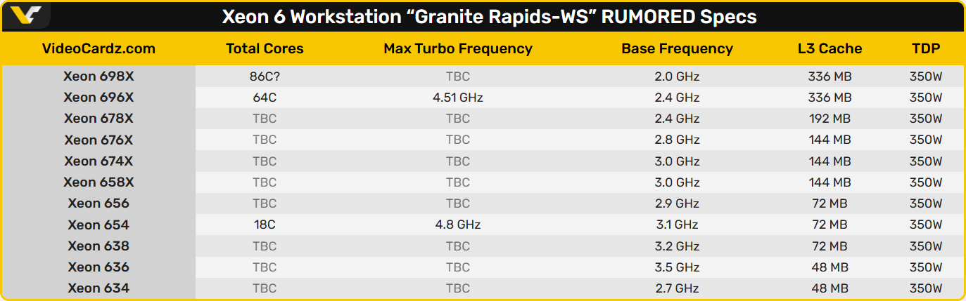 Згідно з наданою інформацією, процесори Intel Xeon 6 для робочих станцій коштуватимуть від 541 до 8295 доларів. Точні специфікації новинок, на жаль, поки не уточнюються. Але, наприклад, передтоповий Xeon 696X раніше був помічений у базі тестового пакета SiSoftware, «засвітивши» 64 ядра та 336 мегабайтів кеш-пам’яті третього рівня. Флагманський Xeon 698X, ймовірно, зможе запропонувати ще більше x86-ядер.