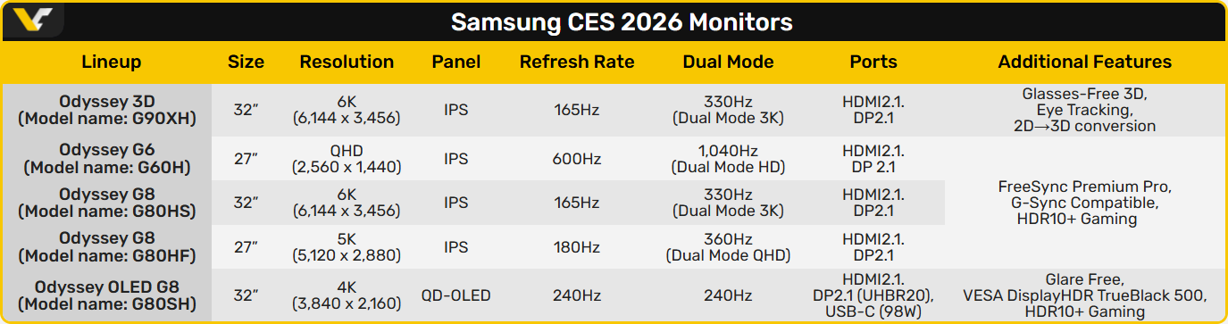 Флагманською моделлю стане Samsung Odyssey 3D (G90XH) зі штатною роздільною здатністю 6K (6144×3456 пікселів), частотою оновлення 165 Гц та можливістю відображення 3D-контенту без додаткових окулярів та інших допоміжних засобів. Він виконаний на базі матриці IPS і підтримує альтернативний режим роботи — 3K@330 Гц.